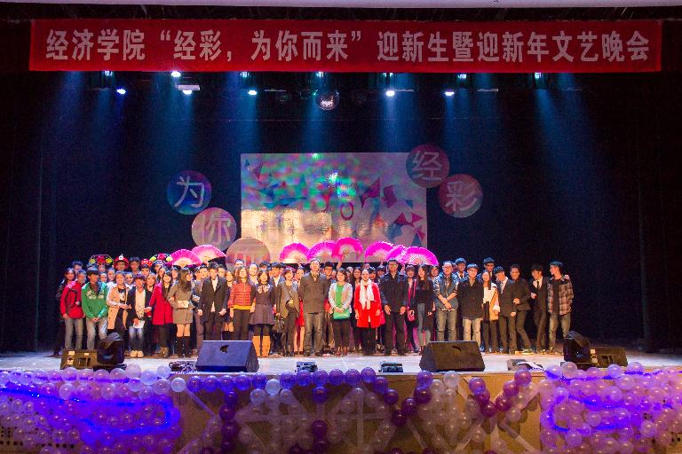 2014级“经彩为你而来”迎新生晚会在东校区高职礼堂隆重举行。学院党委书记祁勇,党委副书记于苗,副院长张旭,各学院教师共同与2013级、2014级600多名学生观看了此次晚会。晚会在火辣动感的开场舞《男子汉》中拉开了序幕。伴随着热烈的掌声,祁勇书记向新生致辞,希望大家积极进取,共创美好未来。随后,迎新晚会正式开始,由同学们自编自导自演节目丰富多彩,包括相声、小品、歌唱、音乐剧、舞蹈串烧等,在表演阵容上也是老师、代班学长、新生们齐上阵,精彩的表演将气氛一次次推向高潮。最后,晚会在《相亲相爱》的热情旋律中晚会圆满落幕。