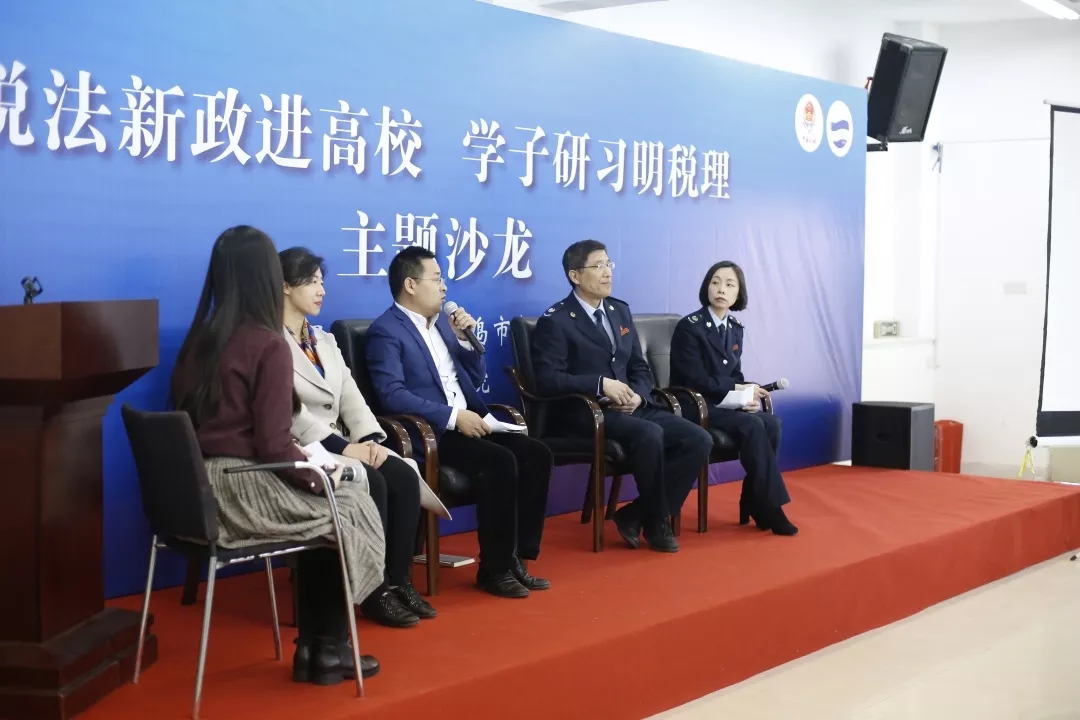 与市南区税务局达成深度合作。在主题沙龙上,税务部门领导介绍减税降费最新情况和即将开展的降低社保费率工作,税务干部就减税降费、个人所得税、增值税、企业所得税等热点税种做政策解读。学院专家教授从专业角度进行就业去向引导以及新政策的解读与学习,通过分享交流、互动讨论等形式将税法知识普及给青年学子。同时现场聘请有意向的优秀学生代表为减税降费政策宣讲志愿者,营造“人人争做减税降费政策宣讲志愿者”的良好宣传氛围。