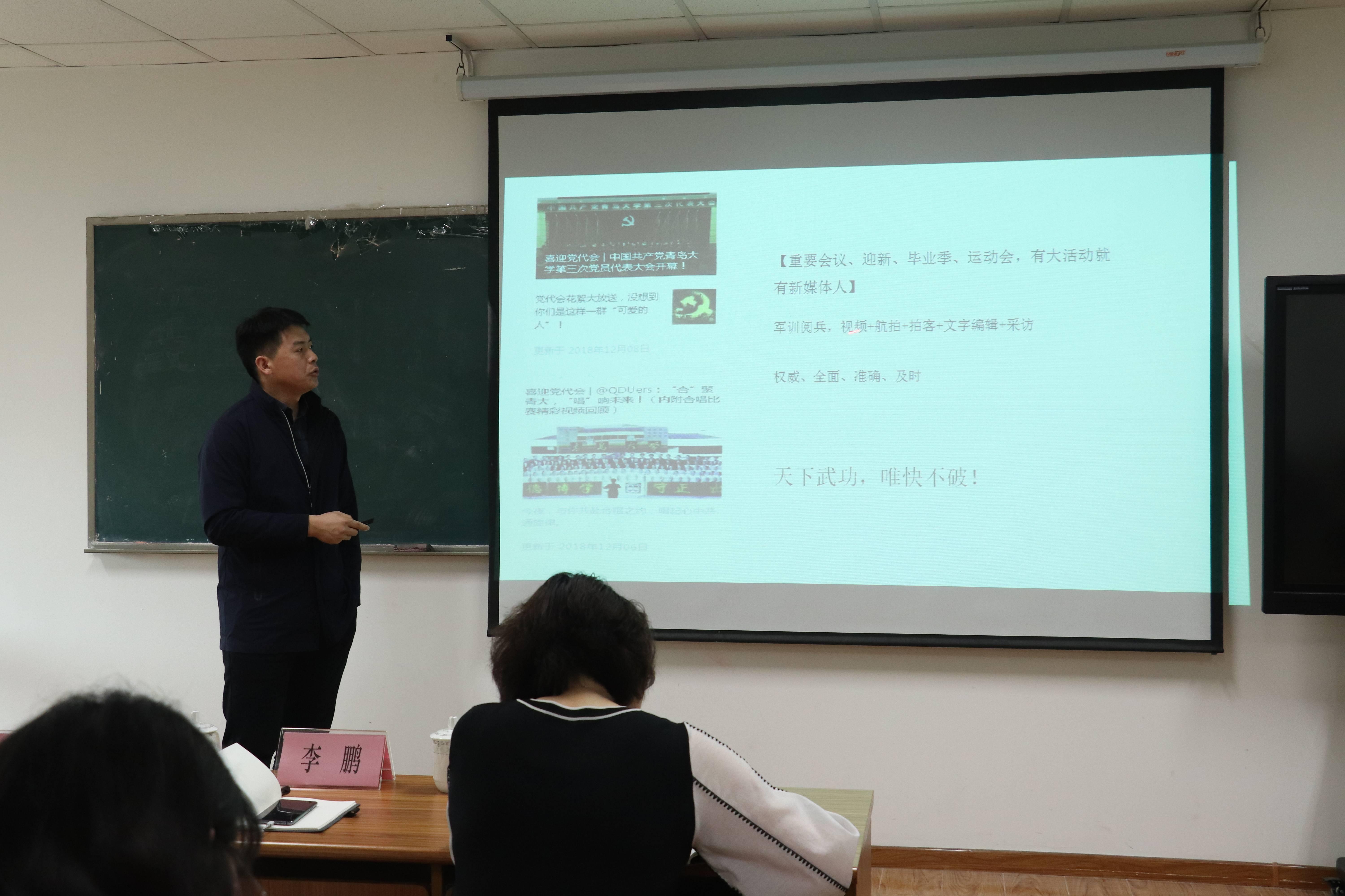 培训班上,李鹏为大家作了题为“青大新媒体运营那些事”的经验交流。他结合青大新媒体平台成功运营的实例,提出“新媒体运营四问”;通过分享众多优秀公众号的精准定位经验,强调了内容、调性的重要性;并对樱花动漫