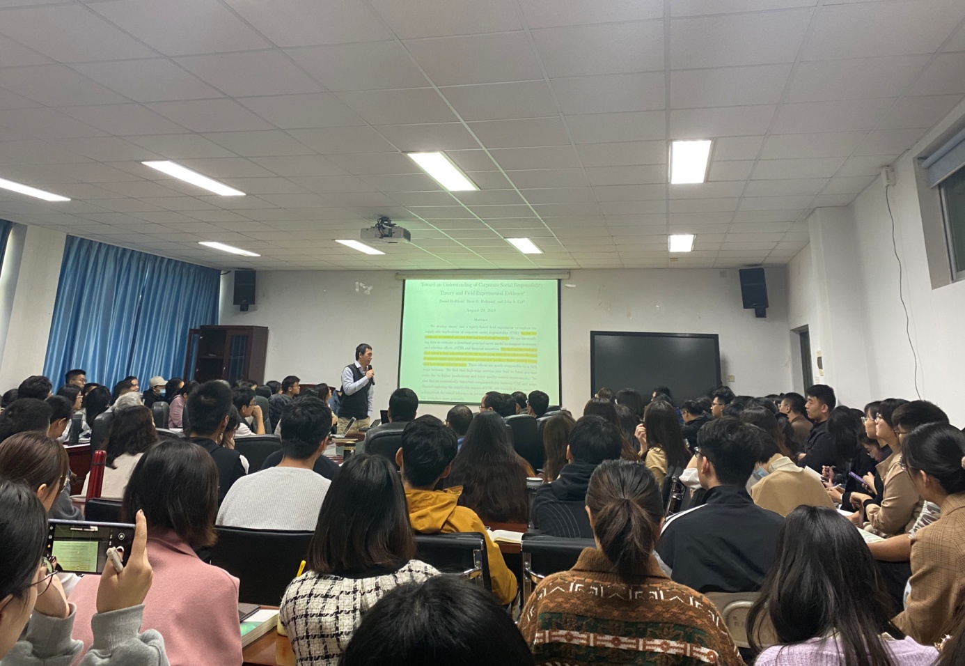 陈强教授首先介绍了随机实验和自然实验的概念,通过几个经典例子说明并解释了随机实验执行过程中可能出现的有效性问题,并在一元回归模型的基础上引入更多解释变量,循序渐进地讲述了双重差分法的原理和推导过程。随后,陈教授讲述了平行趋势假定原理和检验方法。最后,陈强教授展示了双重差分的Stata命令,并以最低工资的自然实验为例,逐步演示了经典DID Stata命令和输出结果,并对结果进行了详细解释。此外,陈强教授还通过经典案例(Big Bad Banks)对当个体的处理期不完全一致时需采用的多期异时DID做了深入讲解。讲座圆满完成,师生们表示收获良多。