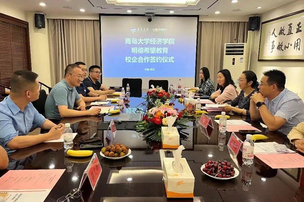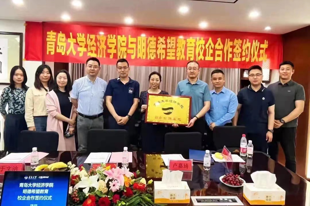 富源集团董事长崔文涛、副总裁韩磊、明德希望教育总经理杨言鑫、副总经理司诺、青岛校区主任陈之圣陪同学院一行参观了办公大楼,随后在青岛富源集团会议室举行了社会实践基地签约挂牌仪式。崔文涛代表富源集团向樱花动漫