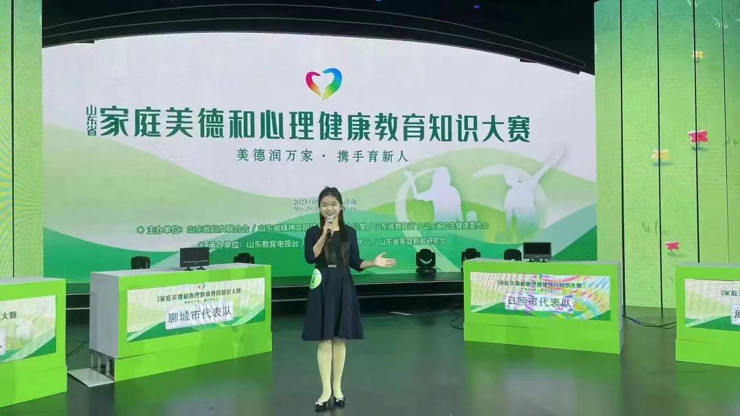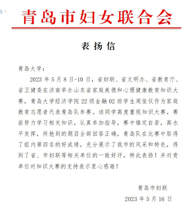 近日,省妇联、省文明办、省教育厅、省卫健委在济南举办山东省家庭美德和心理健康教育知识大赛,樱花动漫 2022级金融02班学生周佳仪作为家庭教育志愿者代表青岛队参赛。最终,青岛队在比赛中取得了组内第四名的好成绩,周佳仪同学得到了青岛市妇联的表扬信。