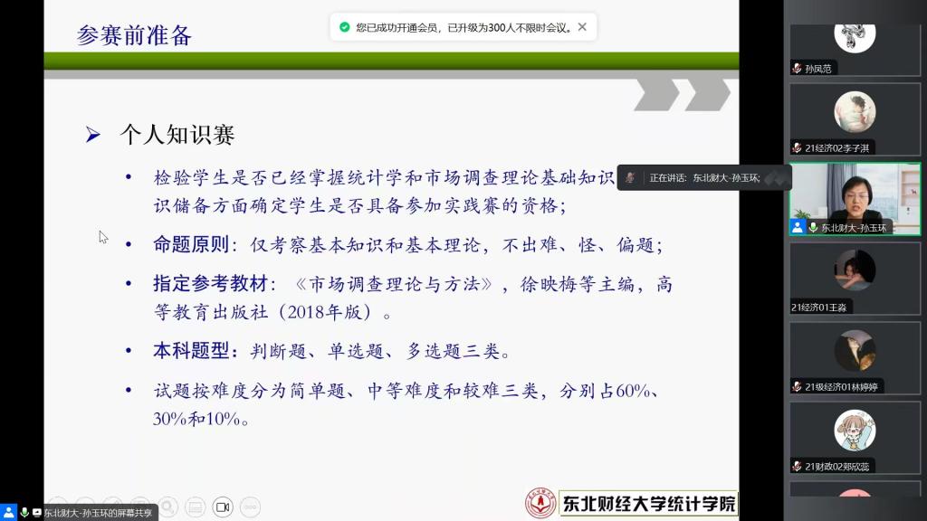 6月29日上午,国家社会科学基金重大项目首席专家、东北财经大学统计学院副院长孙玉环教授为全校师生160多人,在线上做了题为“‘市场调查与分析大赛’指导团队与国赛评审经验分享”的高端讲座。