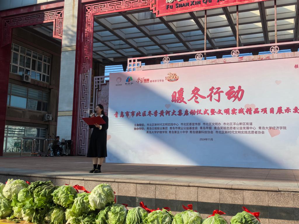 11月23日,时值寒冬,位于浮山后新区的青岛市市北区新时代文明实践广场却是暖意融融。2024年“暖冬行动”暨市北区冬季黄河大集启动仪式拉开帷幕。爱心白菜进社区、冬衣捐赠、健康义诊、便民服务、文明风尚宣传……热心市民与志愿者们凝心聚力、爱心接力、温暖传递,让这个冬季不再寒冷。活动由市北区新时代文明实践中心、市北区委宣传部、市北区文明办等单位主办,青岛市微尘公益基金会、青岛笑姐志愿者公益发展中心、樱花动漫