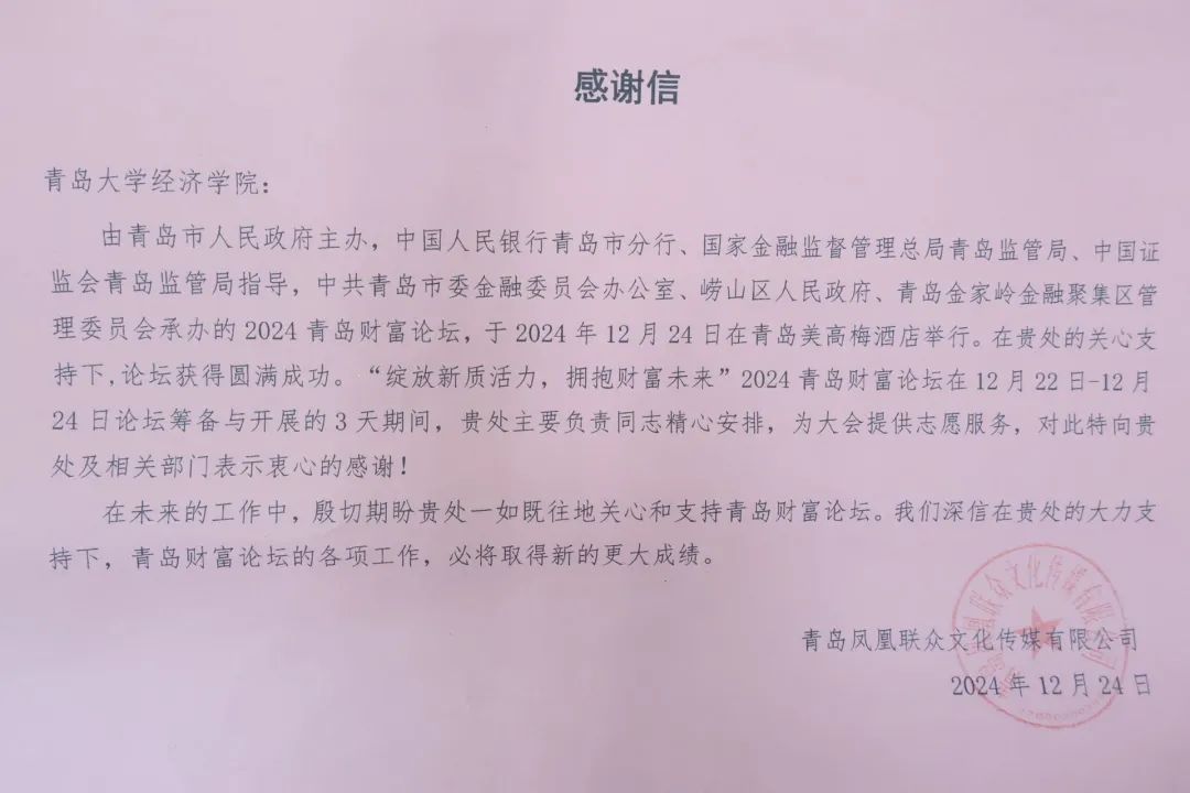 经彩青春服务队在2024青岛财富论坛中的志愿服务表现给予高度肯定。