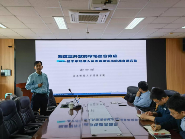 在金家岭校区3号实验楼307会议室成功举办了第188期“经济学名家讲堂”。本期讲座由谢申祥教授主讲,主题为“制度型开放的市场整合效应”,吸引了众多师生的积极参与。