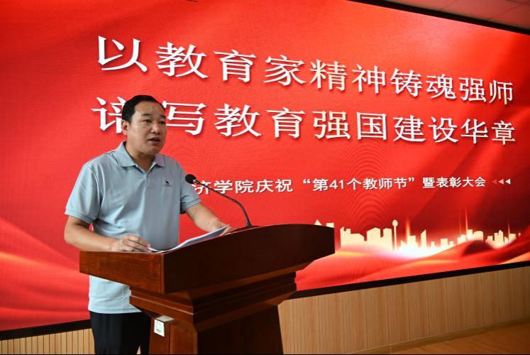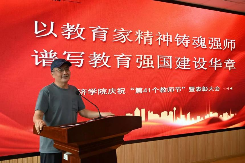 邱建国向全体教师送上节日的问候与祝福,他强调教师在教育事业中的关键作用并结合学习贯彻党的二十届三中全会和《中共中央国务院关于弘扬教育家精神加强新时代高素质专业化教师队伍建设的意见》精神,提出四点期望:一是要牢记“为党育人、为国育才”的初心使命,做“经师”与“人师”的统一者;二是要坚守“学高为师、身正为范”的师德师风,担当教书育人的神圣使命;三是要锤炼“深耕主业、守正创新”的业务能力,迎接教育改革的全新挑战;四是要保持“润物无声、启智润心”的工作态度,创造教育教学的卓越业绩。他鼓励教师们珍视职业荣誉、追求卓越,为学院的繁荣发展贡献力量,并祝愿学院教育事业蓬勃发展、蒸蒸日上。