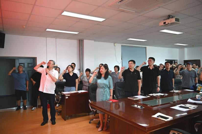 最后全体教师进行集体宣誓:我宣誓,忠诚人民教育事业,依法履行教师职责;为人师表,敬业爱生;严谨治学,修身立德;启智求真,恪守有教无类;因材施教,注重创新发展;为科教兴国,上下求索;为民族复兴,广育英才!