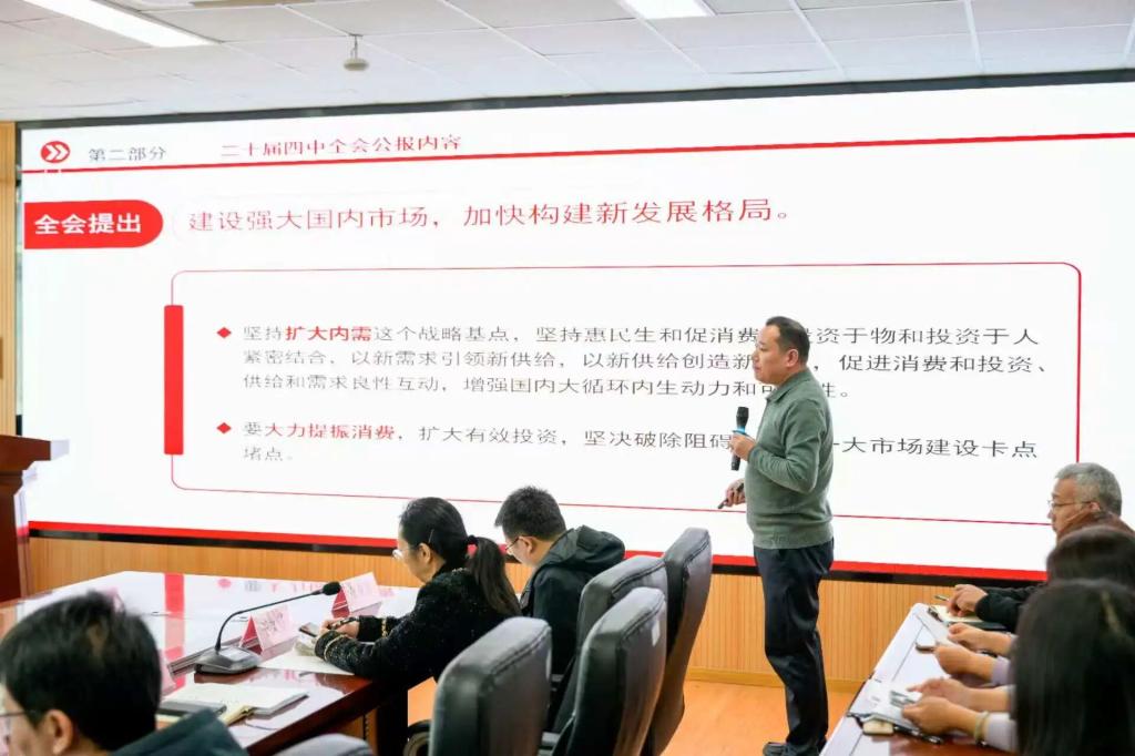 党委书记邱建国作党的二十届四中全会精神专题宣讲报告。他指出,党的二十届四中全会是在“十四五”规划顺利完成、迈向2035年基本实现社会主义现代化目标的关键节点召开的一次重要会议,全会审议通过的《中共中央关于制定国民经济和社会发展第十五个五年规划的建议》,为未来五年乃至更长时期我国经济社会发展指明了方向、提供了遵循。