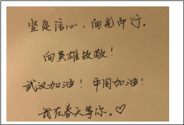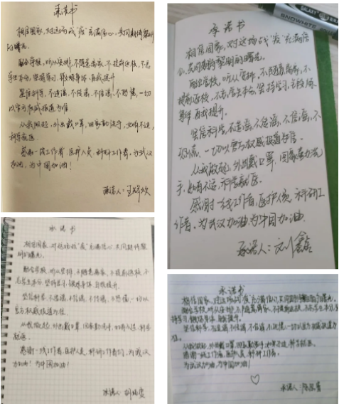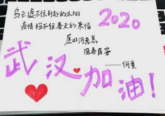 多同学自发参与社区防疫工作,志愿城镇中的物资运输等。也有同学通过网络捐款的形式奉献爱心,为民族团结提供了一份凝聚力量。除却行动与物质上的努力,身处全国各地的同学们也为武汉送去了温暖的精神鼓励和祝福,通过手写卡片等形式,向疫区和全国传递了一份坚定与信心。