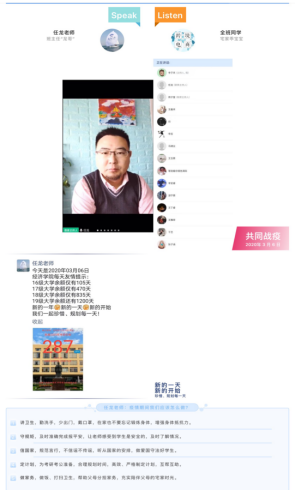 此次网络主题班会,号召了所有年级的各个班级,层层落实,确保了全员参与、人人到位。班主任们全程参与指导,通过挖掘抗击疫情过程中的育人元素,对同学们进行生命、信念、科学、道德思想引领。党委副书记王海荣老师,副院长吕学梁老师,团委书记、18级辅导员戴俊杰老师,学工班主任、17级辅导员任龙老师亲自连线,与同学们深入交流在家情况,指导了学生在战“疫”期间的学习和生活,鼓励同学们积极乐观,增强了同学们战胜疫情的决心和信心。