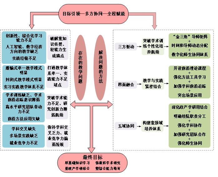 构建“政产学研用、校院、学科、团队、师生”五域协同育人体系。第一,深化政产学研用合作。学科与地方政府部门、企事业单位建立长期稳定合作关系,邀请行业导师深度参与人才培养方案的制定与修订,依据行业需求方向优化课程设置,并提供优质实习基地,全面提升研究生职业素养与就业竞争力。第二,明确学校与学院的职责分工。锚定学院办大学的总体责任,以责任书形式明确了学校、学院、学位点的分工协作。学校在学科发展方向、资源调配、对外合作等方面发挥统筹作用;学院引导学科聚焦于人才精细化培养、课程建设、师资队伍建设等工作,形成协同育人合力。第三,切实强化学科协作。推动经济学与数学、系统科学、计算机科学、医学等多学科交叉融合,开设“经济复杂系统分析与建模”等跨学科课程,设立跨学科研究项目(团队),拓宽研究生学术视野。第四,加强团队合作。发挥学术导师、行业导师、技术导师的协同指导优势,组织研究生以团队交叉形式参与科研项目与学科竞赛,构建团队间协同科研、共享资源制度。第五,强化师生协同。教师在教研中注重深度指导与人文关怀,鼓励研究生自主思考和积极探索;研究生则主动反馈学习需求与问题,师生共同参与学术研究与实践活动,在互动中教师及时调整指导策略。成果解决教学问题的思路和方法见图2。
