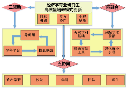 “应用经济学”一级学科博士点和“理论经济学”一级学科硕士点多年人才培养经验、学术成果积累与人才梯队建设,聚焦经济学专业“四轻”痛点——“轻知识积累的问题意识导向、轻研究能力的创新激发导向、轻知识结构的前沿追踪导向、轻实习实践的就业指引导向”,构建了“目标引领——多方协作——全程赋能”的开环人才培养体系,创新提出了“三驱动、四融合、五协同”人才培养思路,并从“课程体系优化、学术能力训练、科研平台赋能、研究团队支撑、政产学研联动”等方面,扎实推进经济学专业研究生培养体系的优化。本成果已取得良好的人才培养成效,在实践中初步实现了“厚基础知识学习、强前沿学术研究、重政产学研融合、塑综合竞争力培育”的经济学专业研究生高质量培养模式创新。成果主要体系如图1所示。